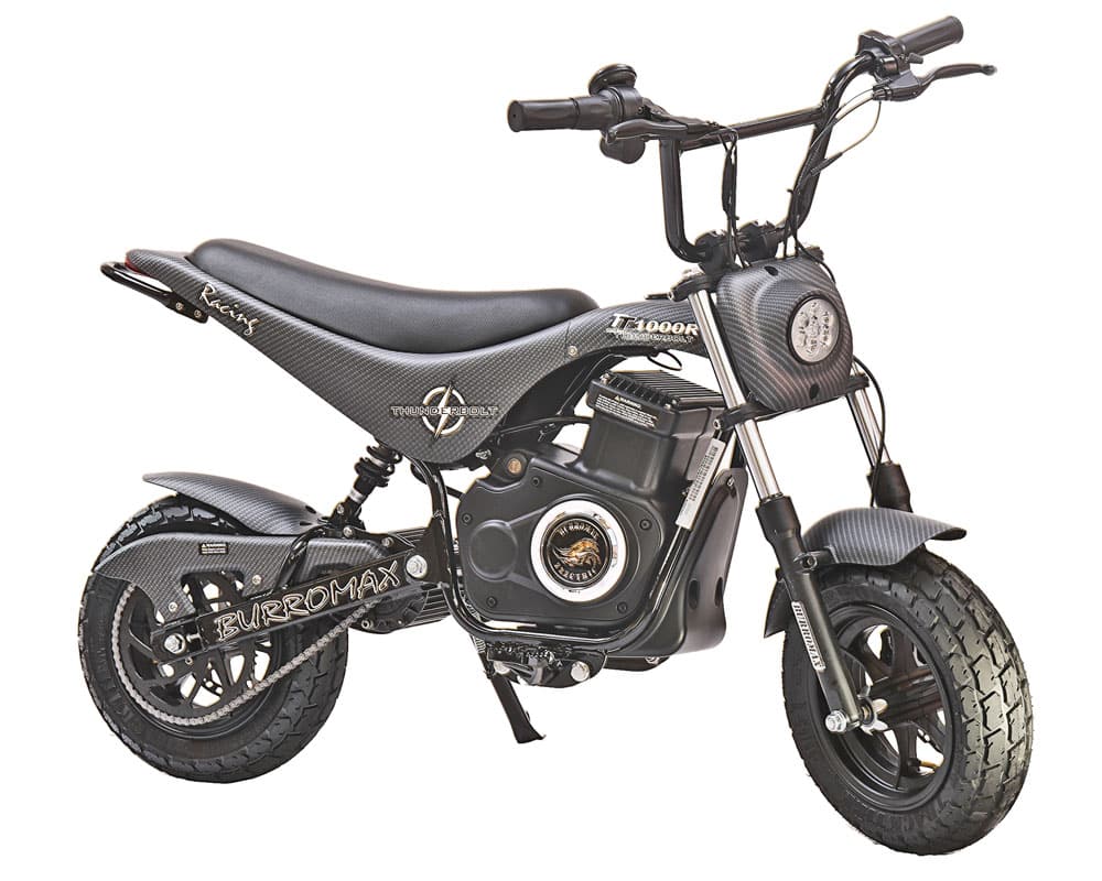 The TT1000R Thunderbolt Mini Bike offers up a midsized Burromax Mini Bike that has lots of performance and features you will enjoy that are on par with the larger TT1600R but in a smaller package. This totally new heavy duty frame design uses larger axles, brakes and forks than the TT750R and combines them with some TT1600 components to make a very durable chassis for larger riders.